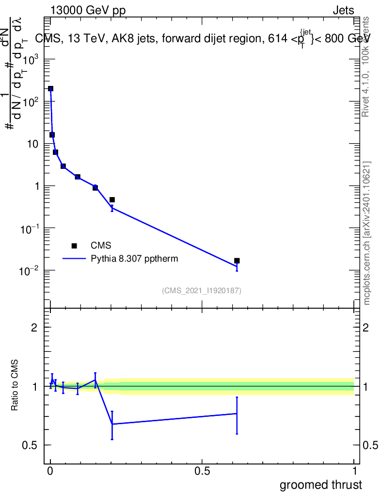 Lines: data, pythia8 8.307 pptherm |