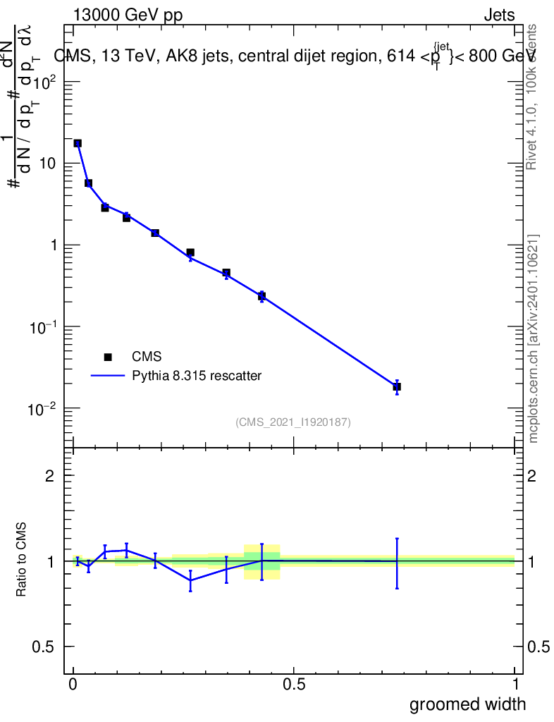 Lines: data, pythia8 8.315 rescatter |