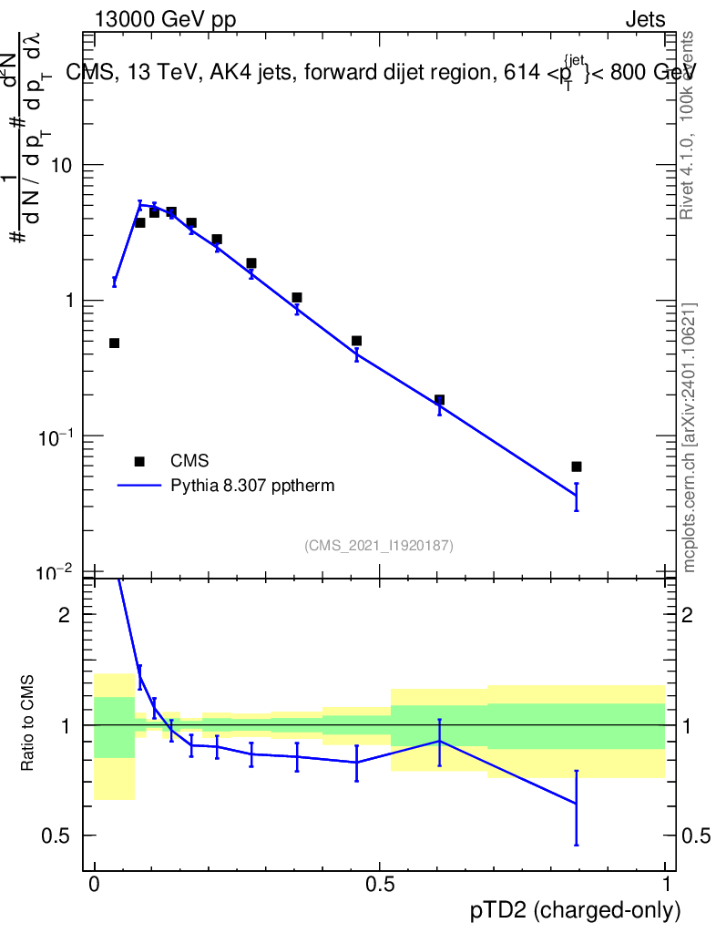 Lines: data, pythia8 8.307 pptherm |