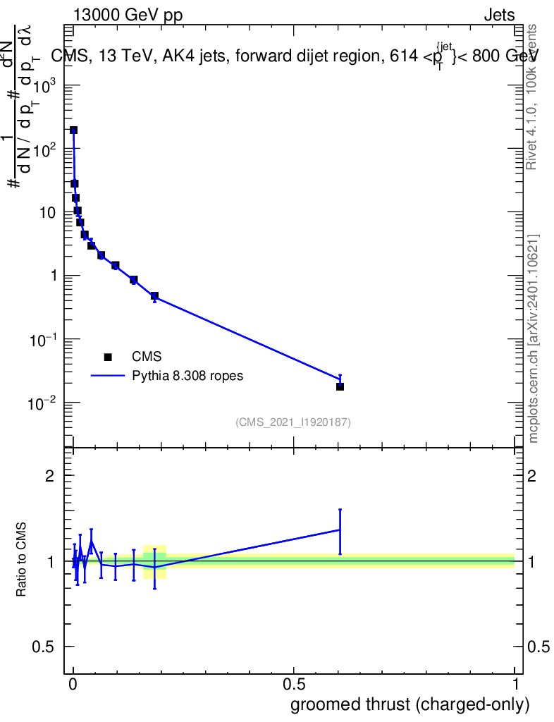 Lines: data, pythia8 8.308 ropes |