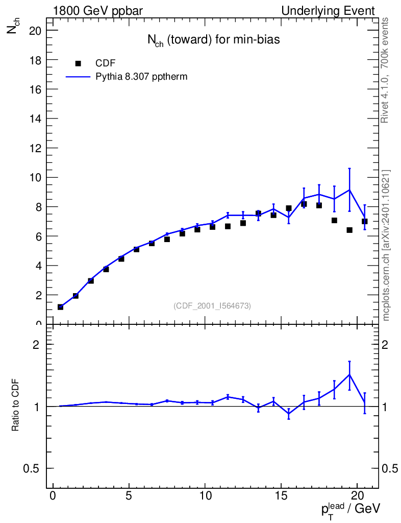 Lines: data, pythia8 8.307 pptherm |
