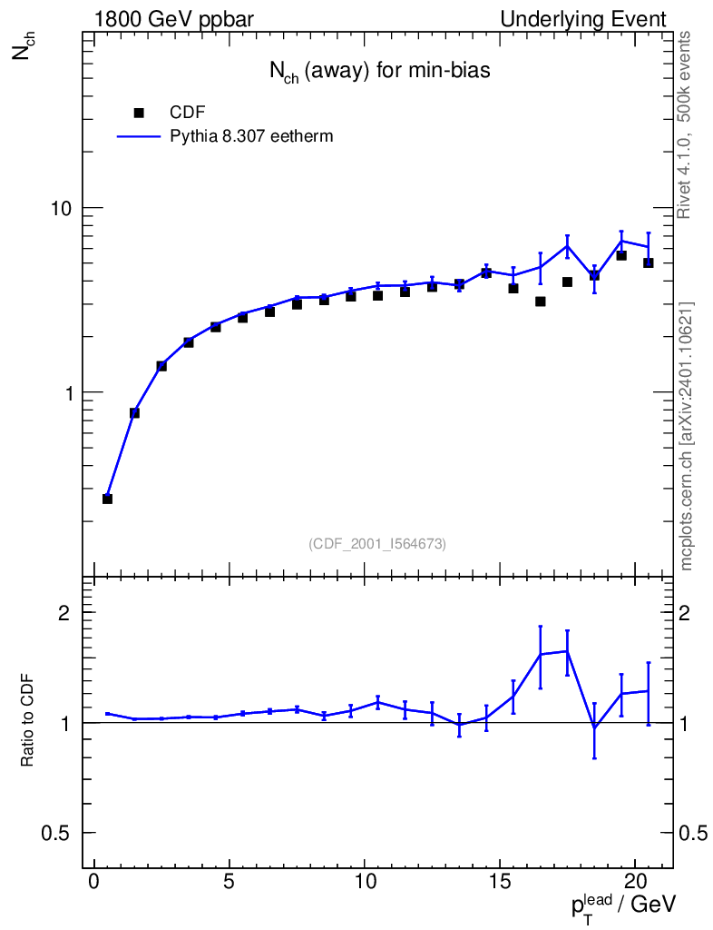 Plot of nch-vs-pt-away in 1800 GeV ppbar collisions