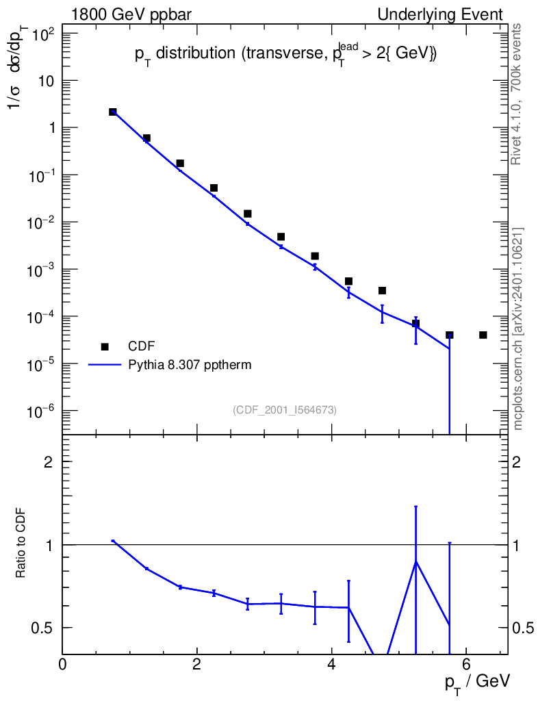 Lines: data, pythia8 8.307 pptherm |