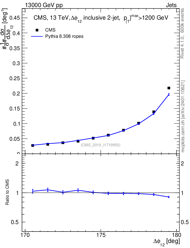 Lines: data, pythia8 8.308 ropes |