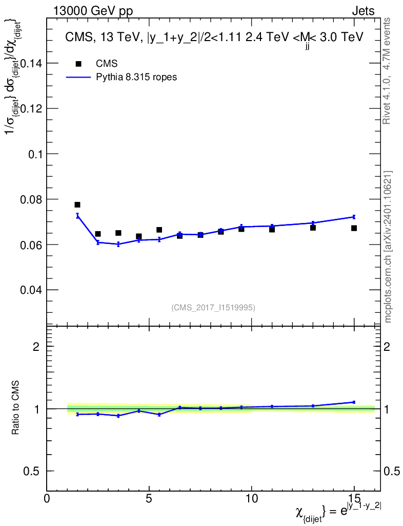 Lines: data, pythia8 8.315 ropes |