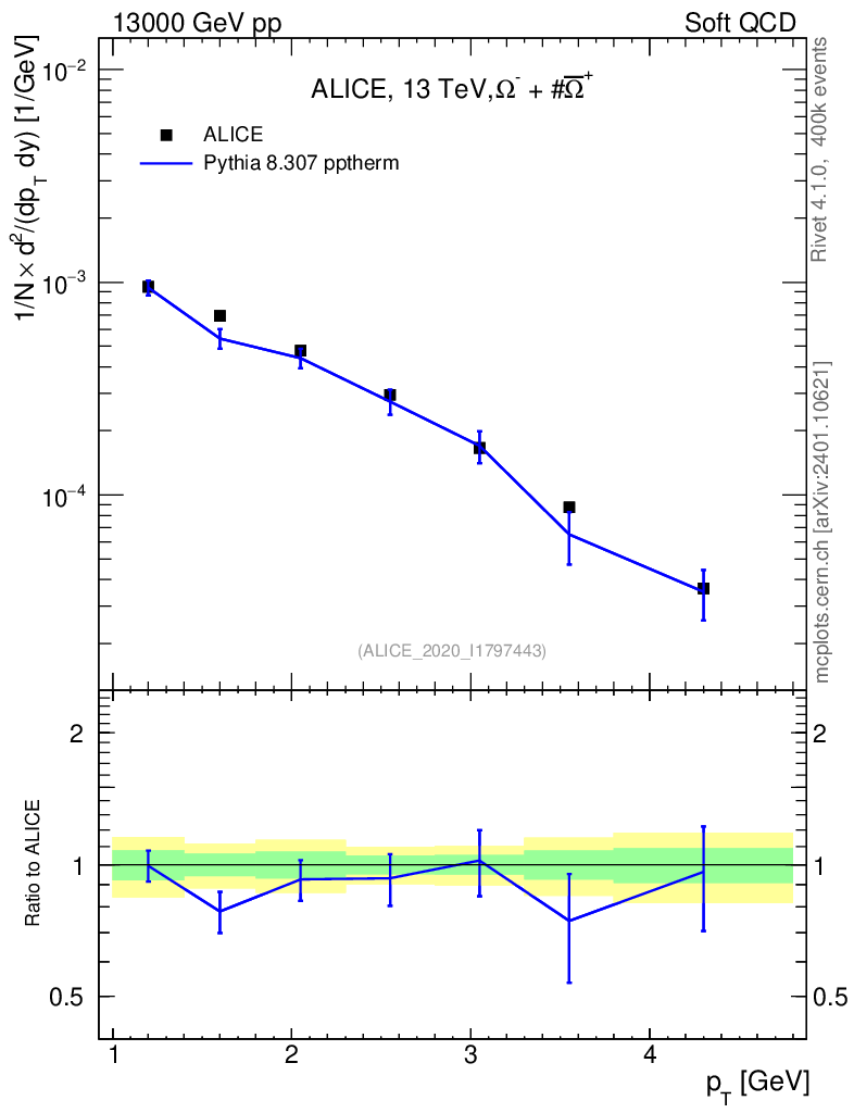 Lines: data, pythia8 8.307 pptherm |