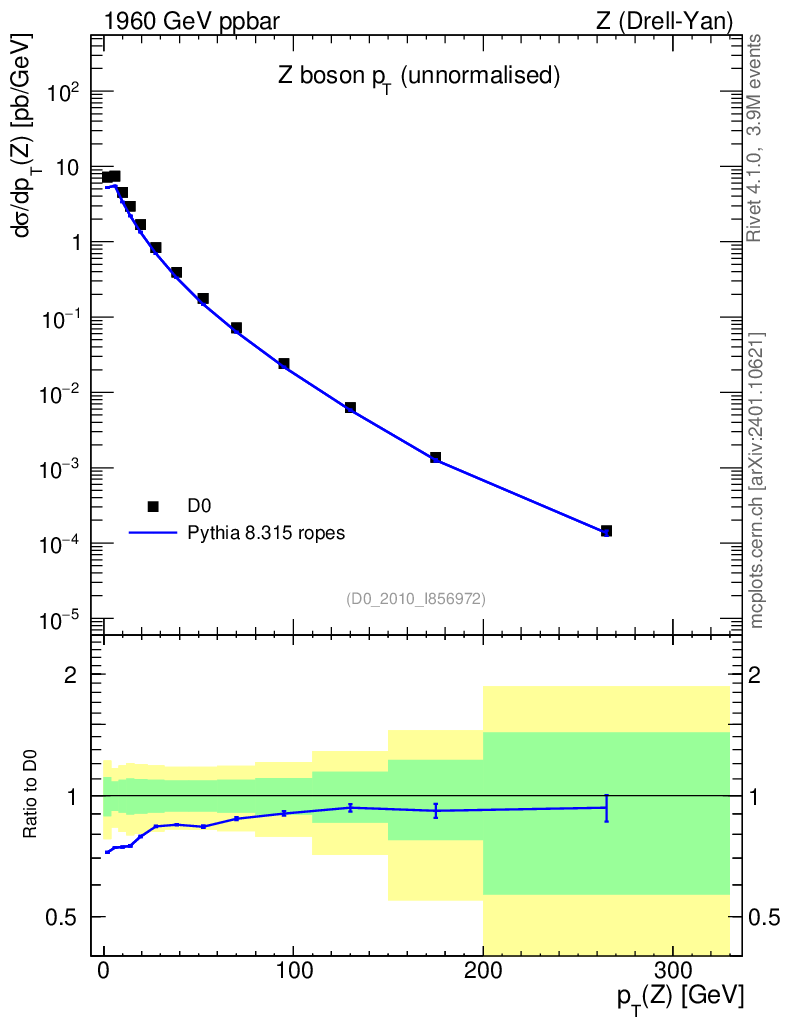 Lines: data, pythia8 8.315 ropes |