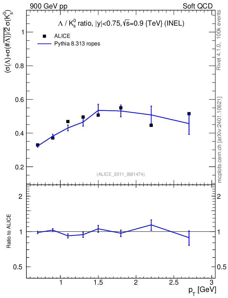 Lines: data, pythia8 8.313 ropes |