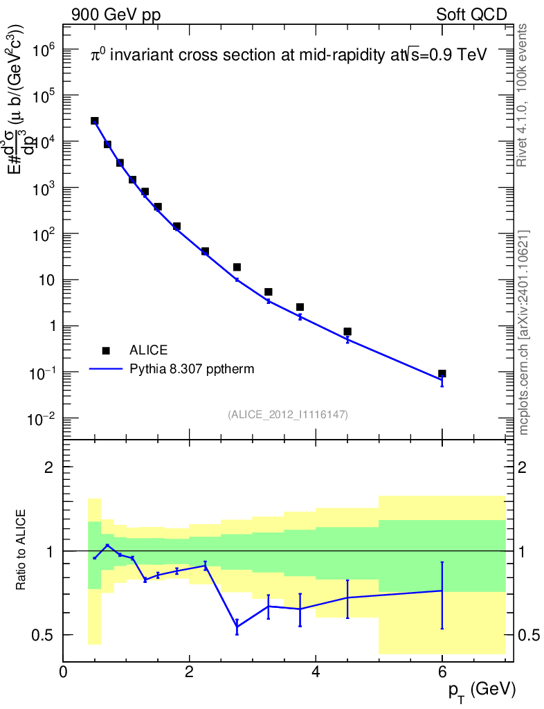 Lines: data, pythia8 8.307 pptherm |