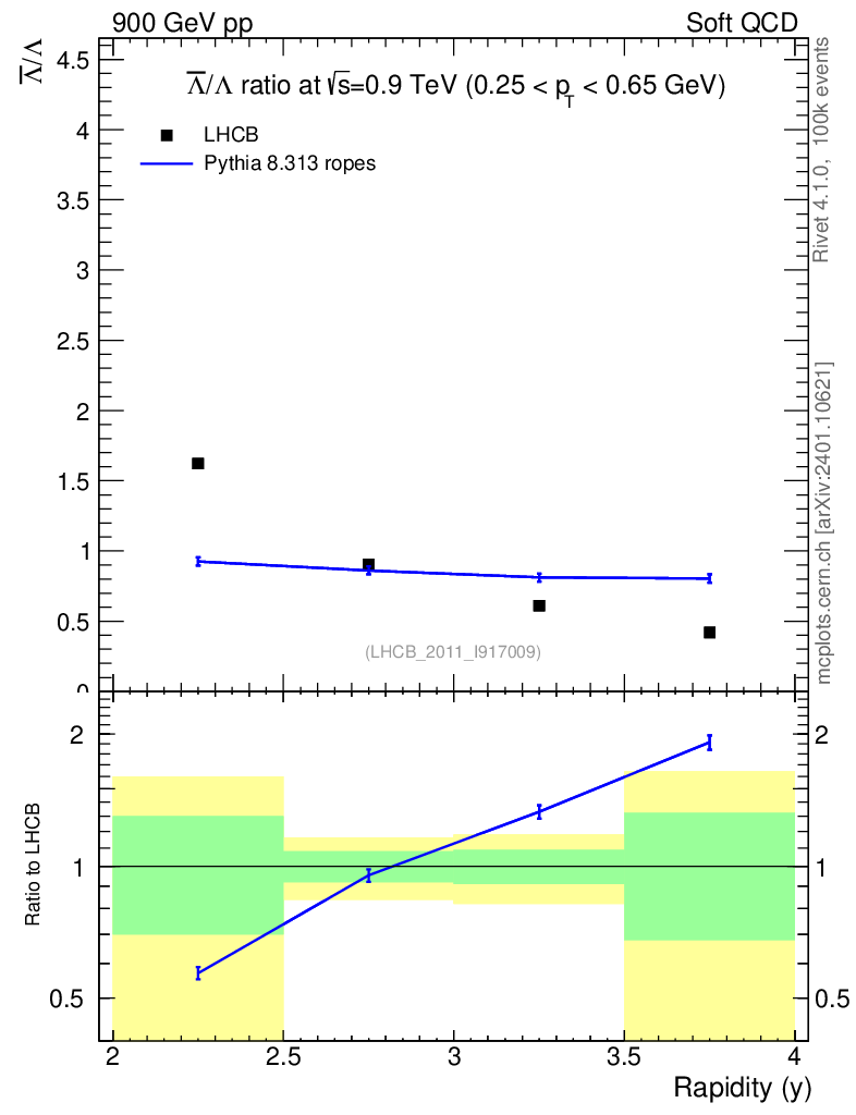 Lines: data, pythia8 8.313 ropes |