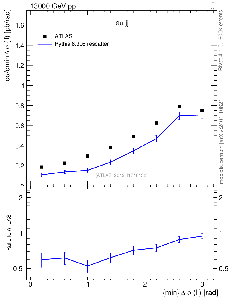 Lines: data, pythia8 8.308 rescatter |