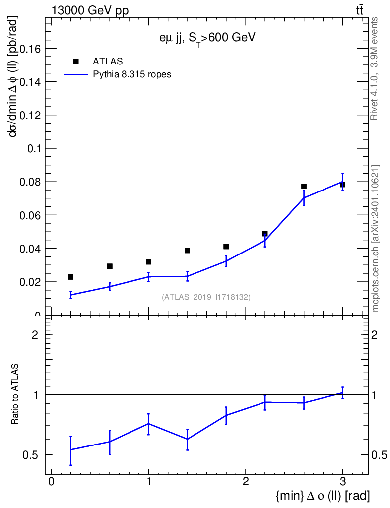 Lines: data, pythia8 8.315 ropes |