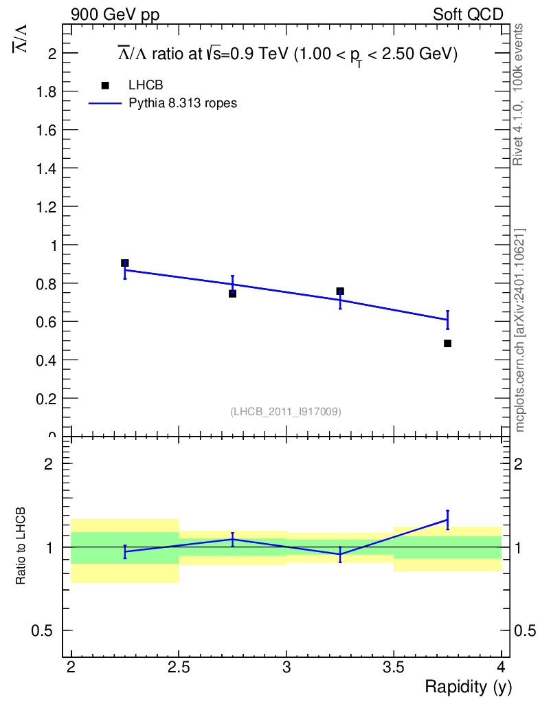 Lines: data, pythia8 8.313 ropes |