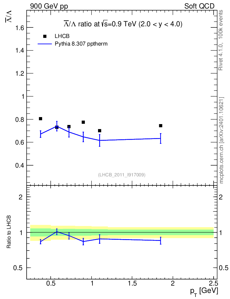 Lines: data, pythia8 8.307 pptherm |