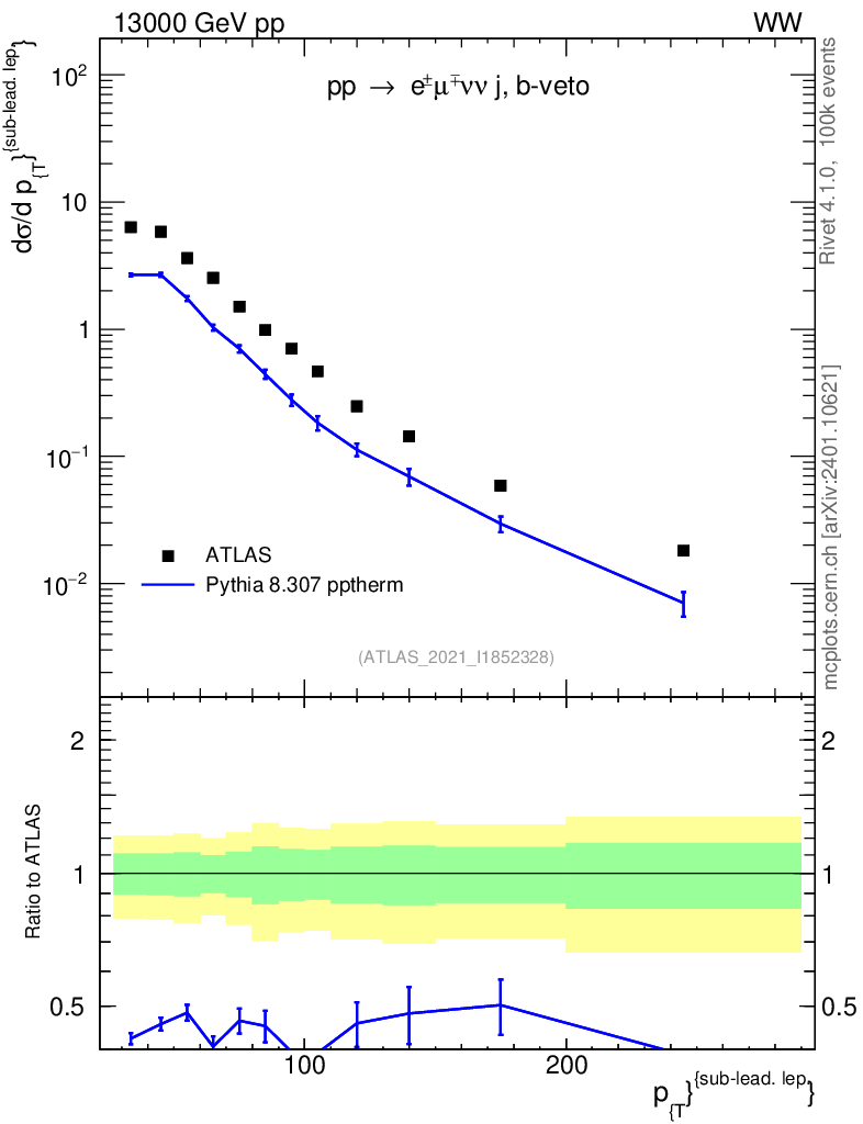 Lines: data, pythia8 8.307 pptherm |