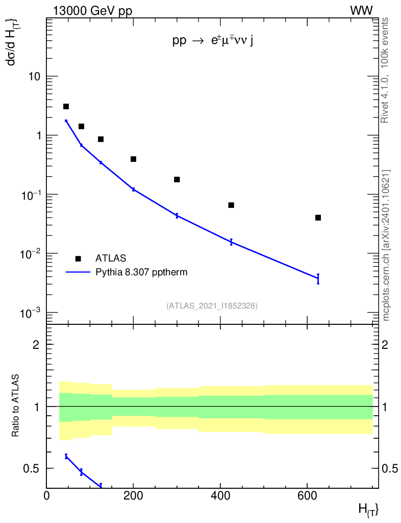 Lines: data, pythia8 8.307 pptherm |