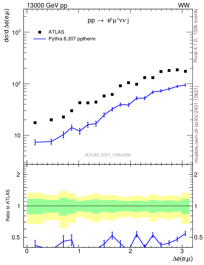 Lines: data, pythia8 8.307 pptherm |