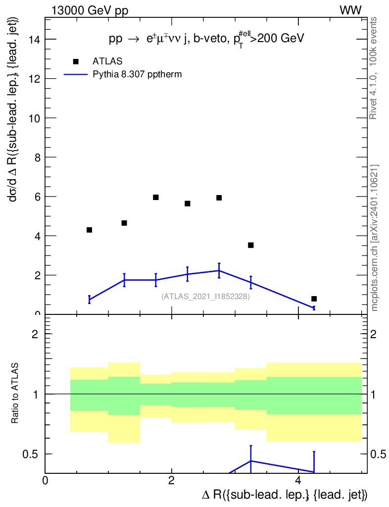 Lines: data, pythia8 8.307 pptherm |
