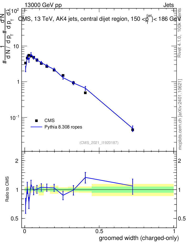 Lines: data, pythia8 8.308 ropes |