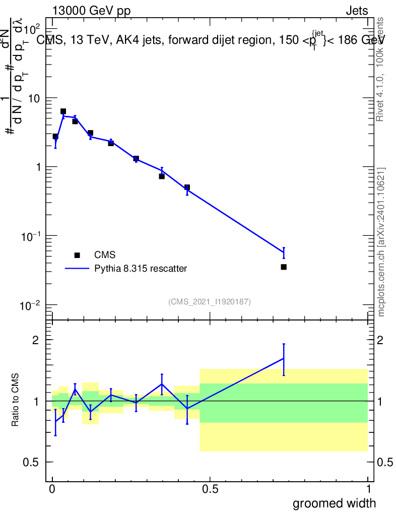 Lines: data, pythia8 8.315 rescatter |