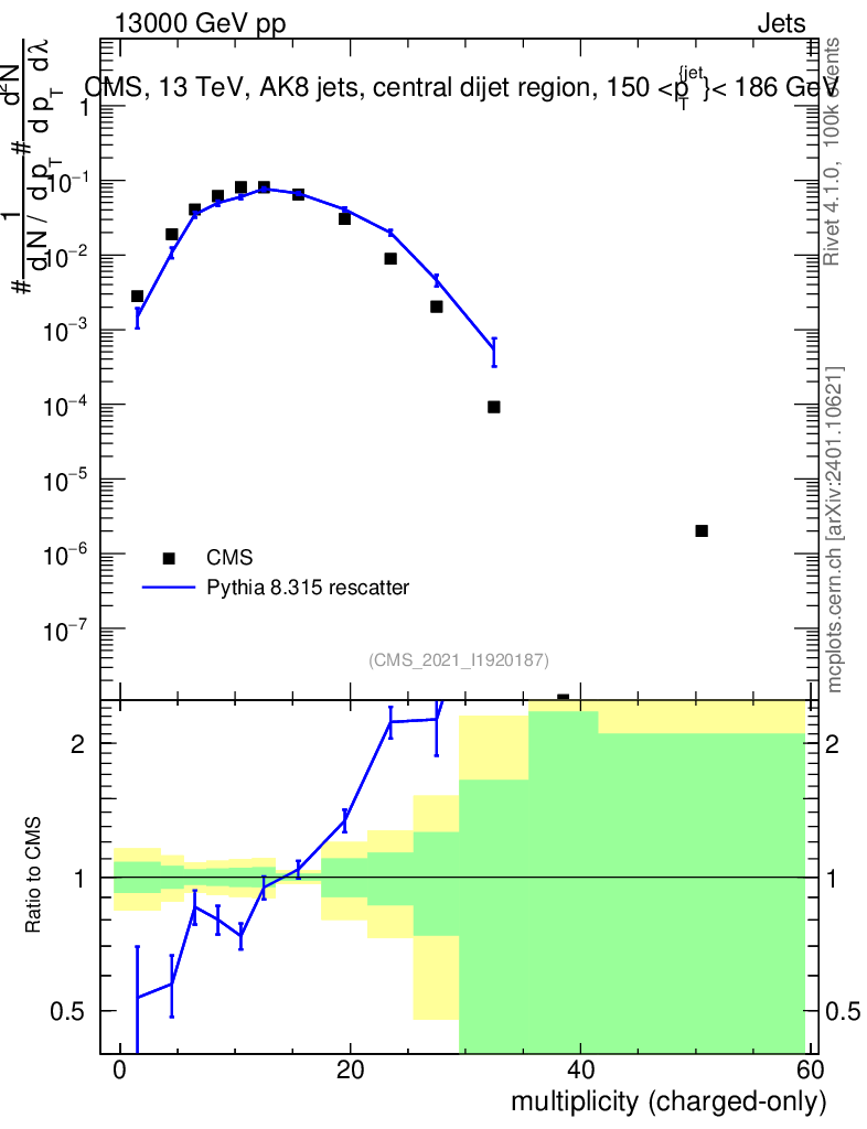 Lines: data, pythia8 8.315 rescatter |