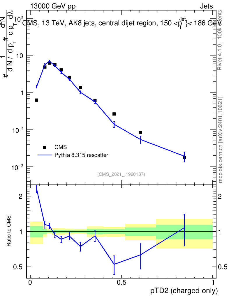 Lines: data, pythia8 8.315 rescatter |