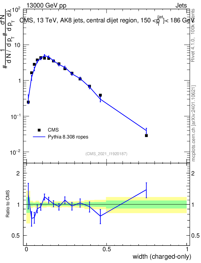 Lines: data, pythia8 8.308 ropes |