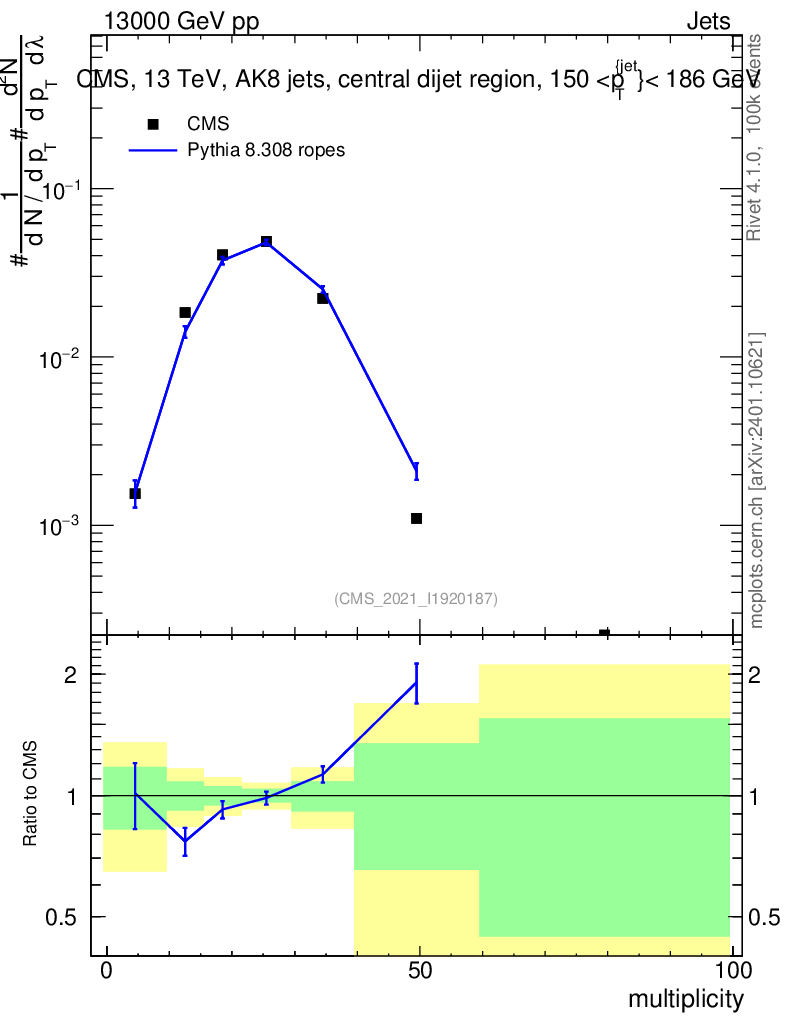 Lines: data, pythia8 8.308 ropes |