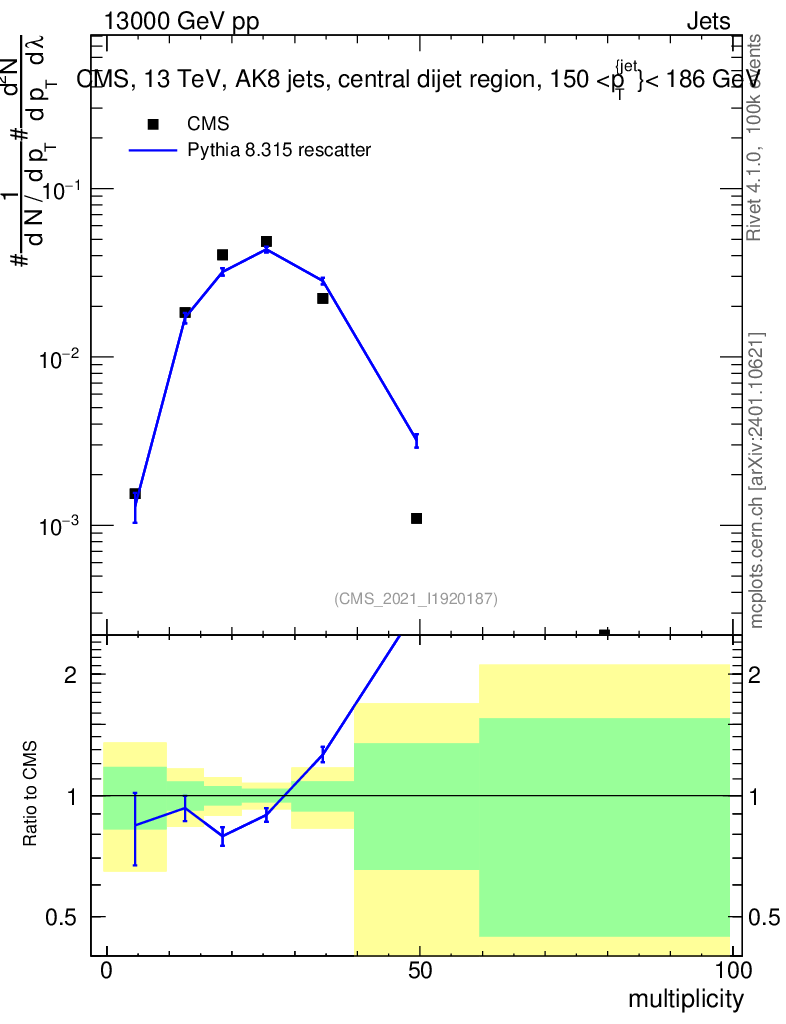 Lines: data, pythia8 8.315 rescatter |