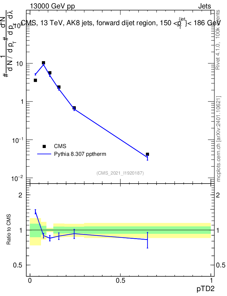 Lines: data, pythia8 8.307 pptherm |