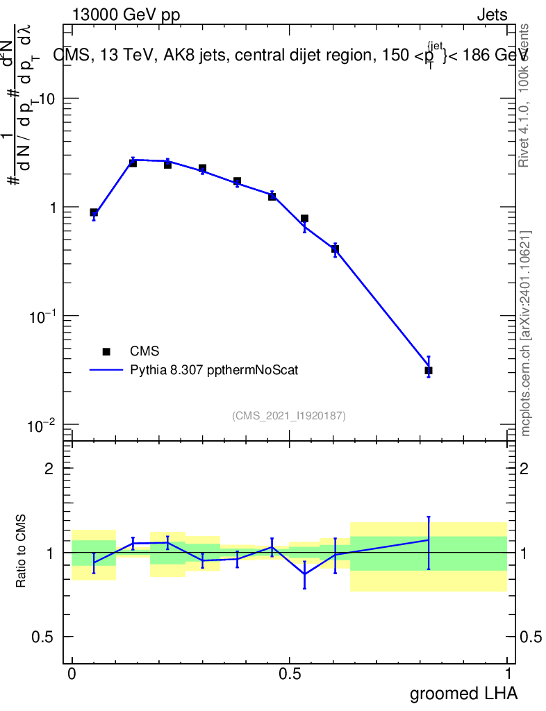 Lines: data, pythia8 8.307 ppthermNoScat |