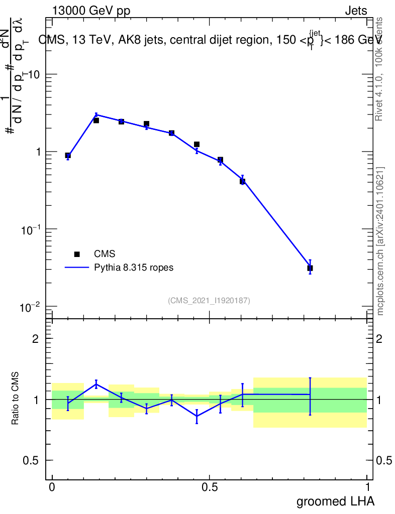 Lines: data, pythia8 8.315 ropes |