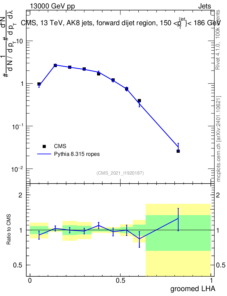 Lines: data, pythia8 8.315 ropes |