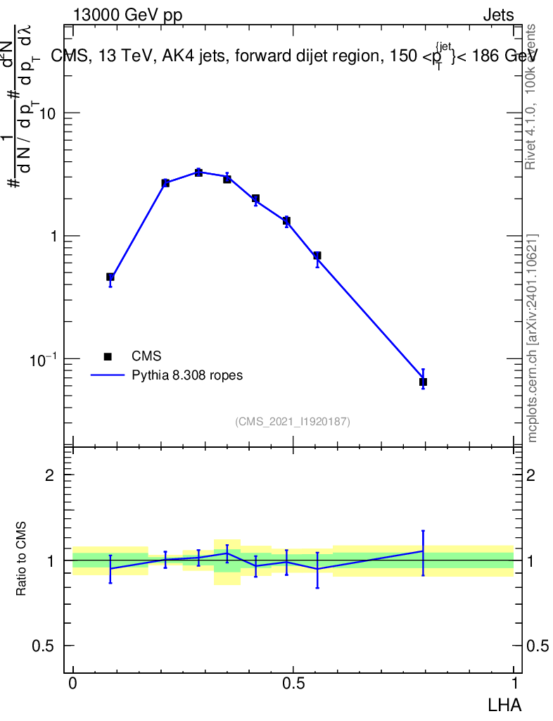 Lines: data, pythia8 8.308 ropes |