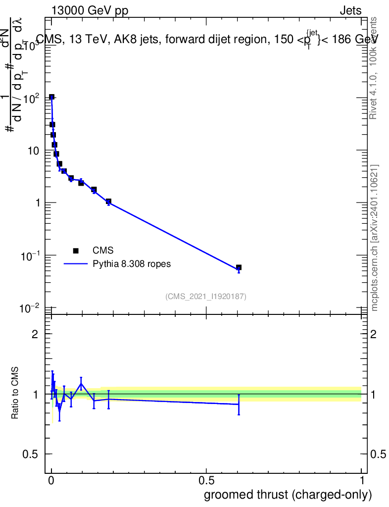 Lines: data, pythia8 8.308 ropes |