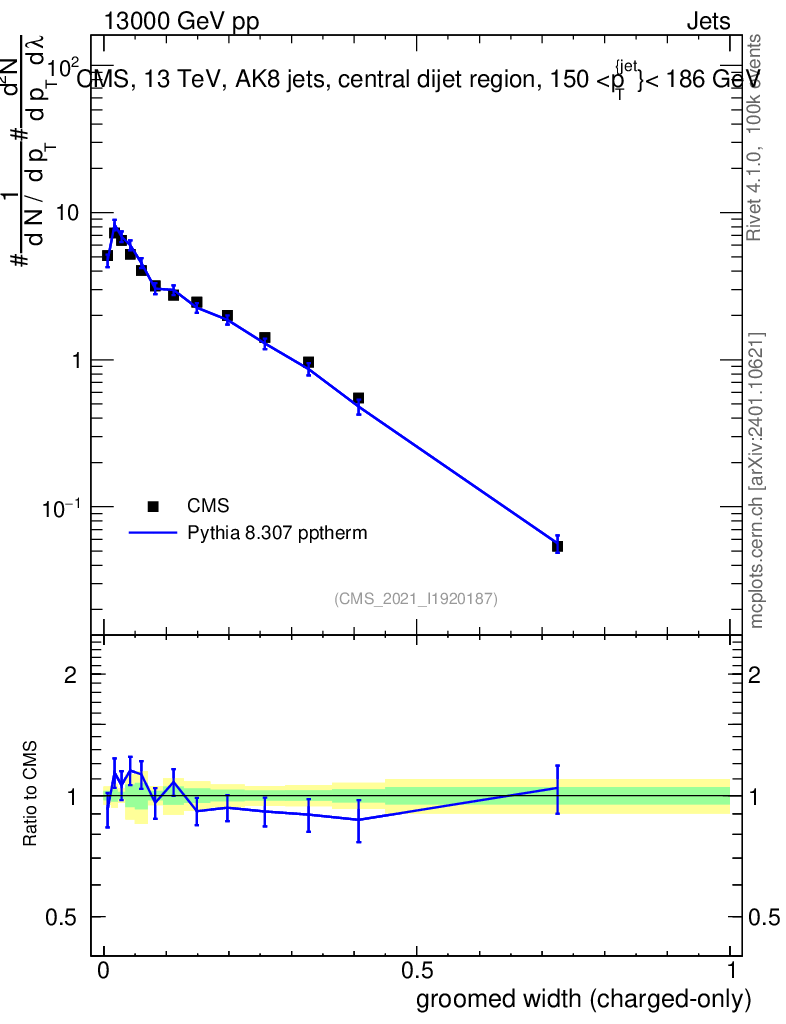 Lines: data, pythia8 8.307 pptherm |