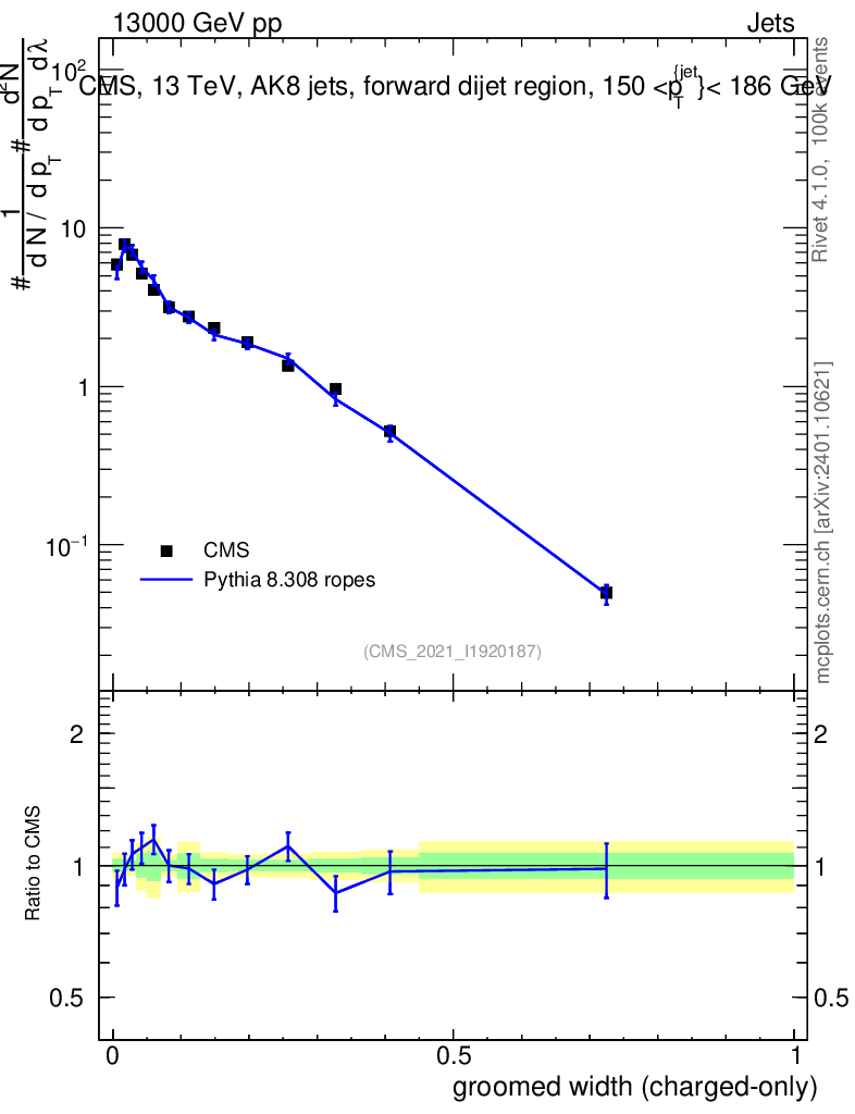 Lines: data, pythia8 8.308 ropes |