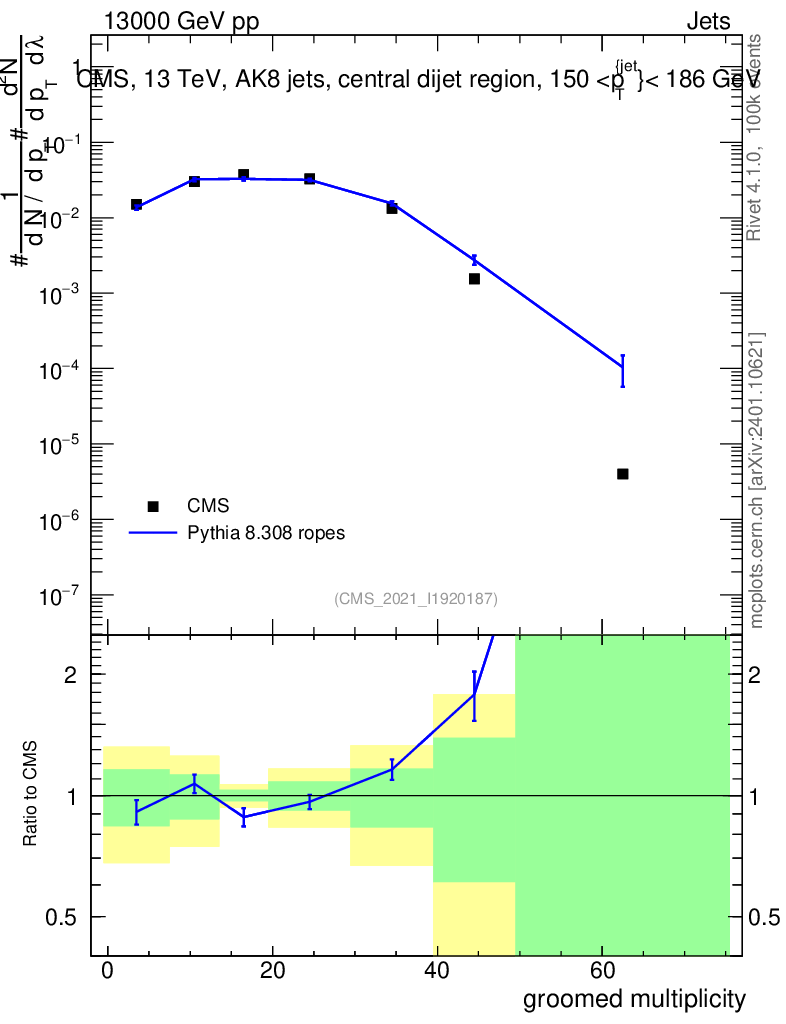 Lines: data, pythia8 8.308 ropes |