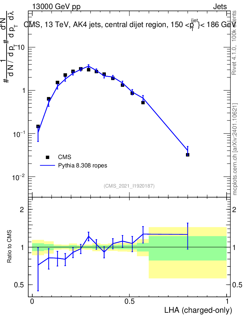 Lines: data, pythia8 8.308 ropes |