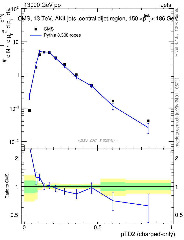 Lines: data, pythia8 8.308 ropes |