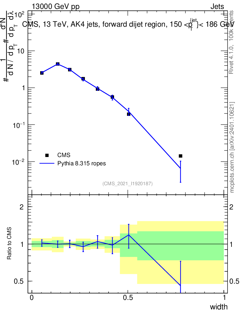 Lines: data, pythia8 8.315 ropes |
