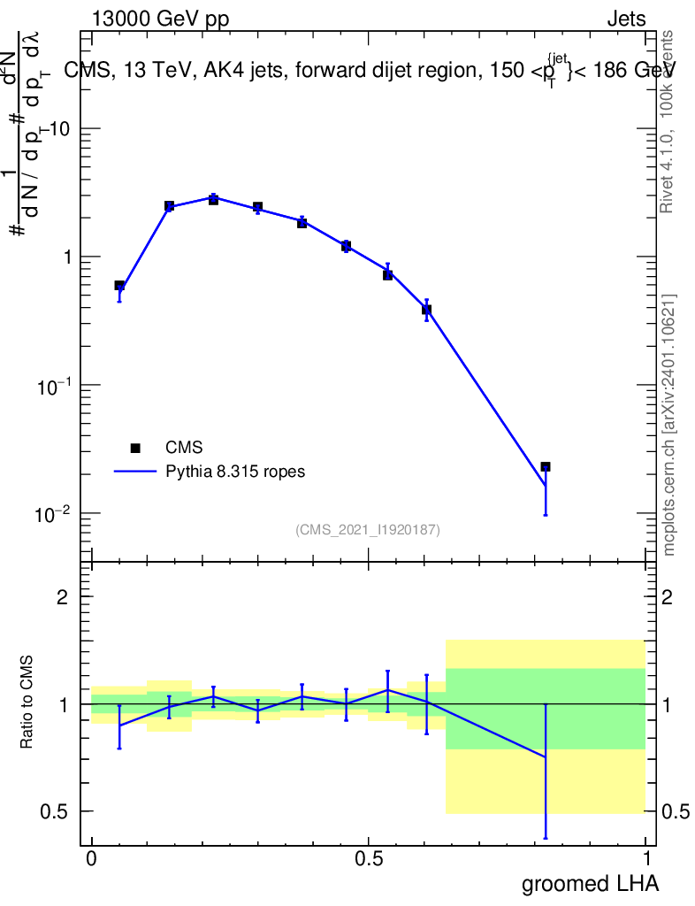 Lines: data, pythia8 8.315 ropes |
