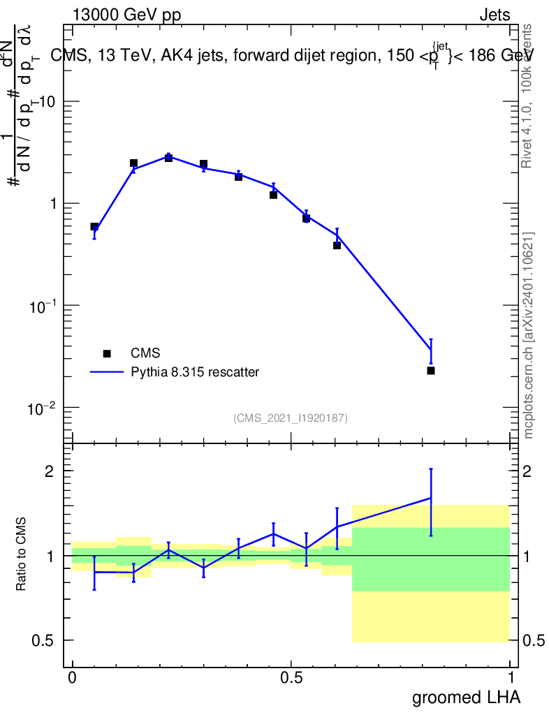 Lines: data, pythia8 8.315 rescatter |