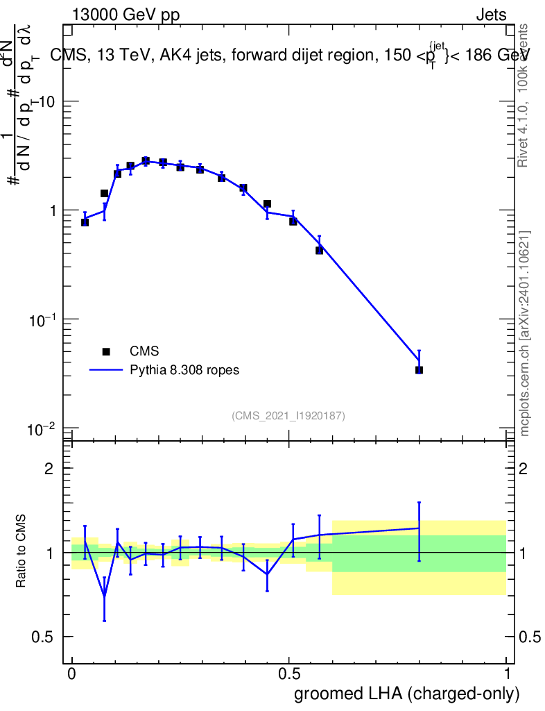 Lines: data, pythia8 8.308 ropes |