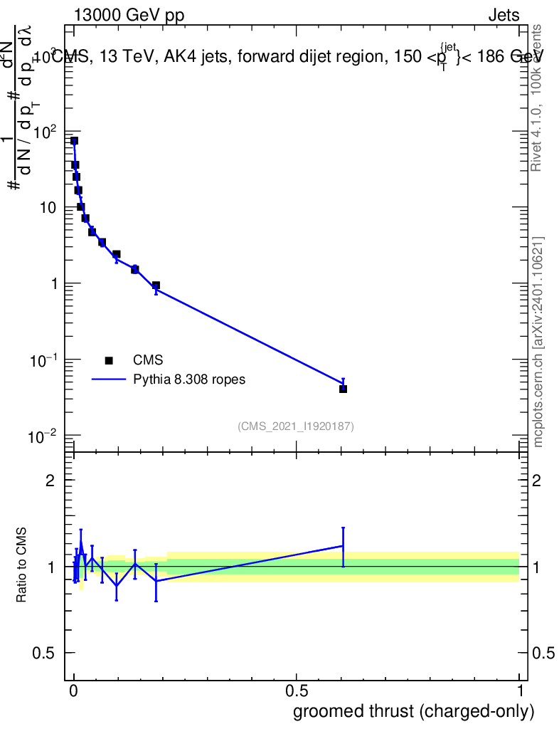 Lines: data, pythia8 8.308 ropes |