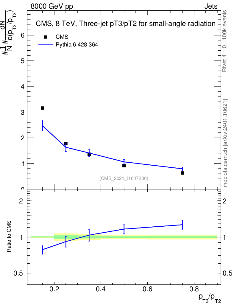 Lines: data, pythia6 6.428 364 |