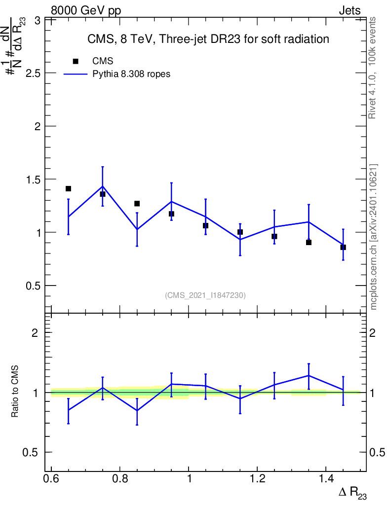 Lines: data, pythia8 8.308 ropes |