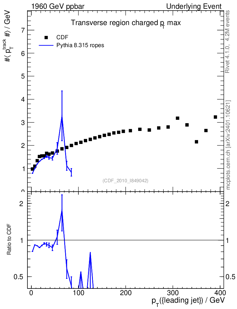 Lines: data, pythia8 8.315 ropes |
