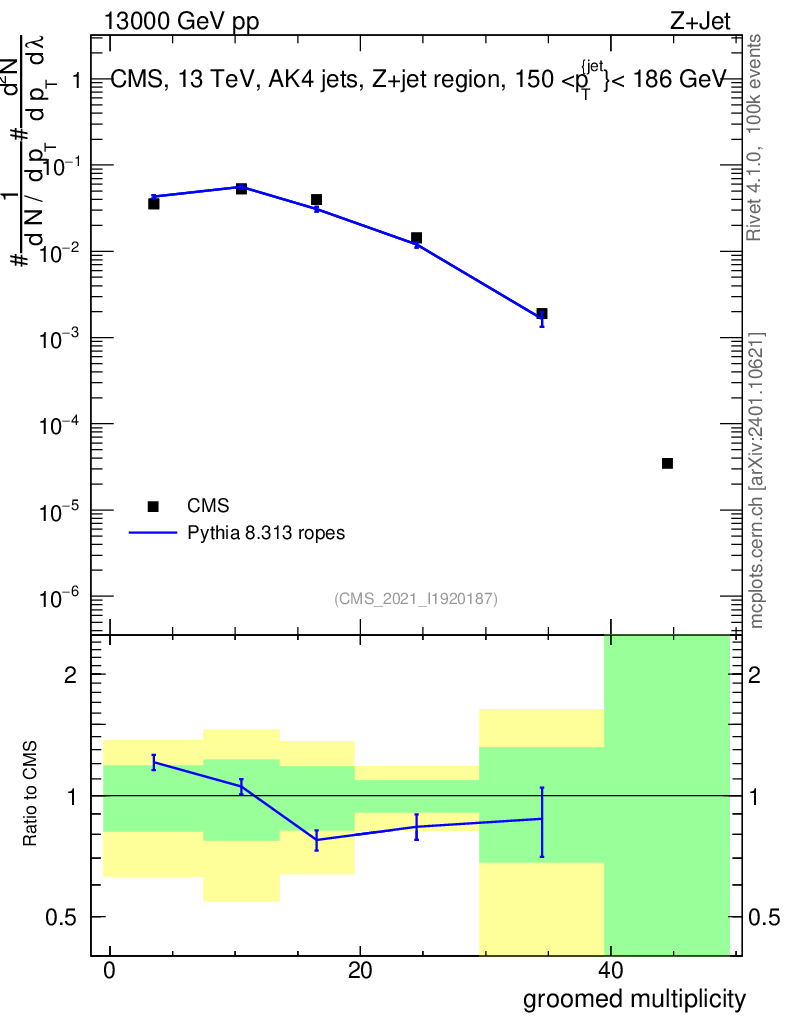 Lines: data, pythia8 8.313 ropes |