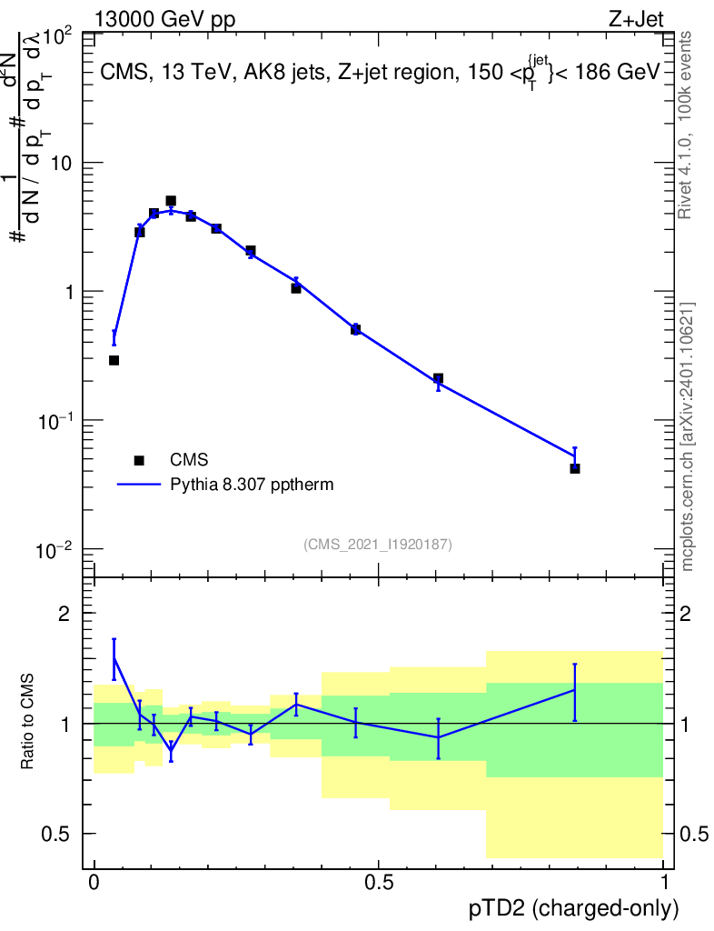 Lines: data, pythia8 8.307 pptherm |